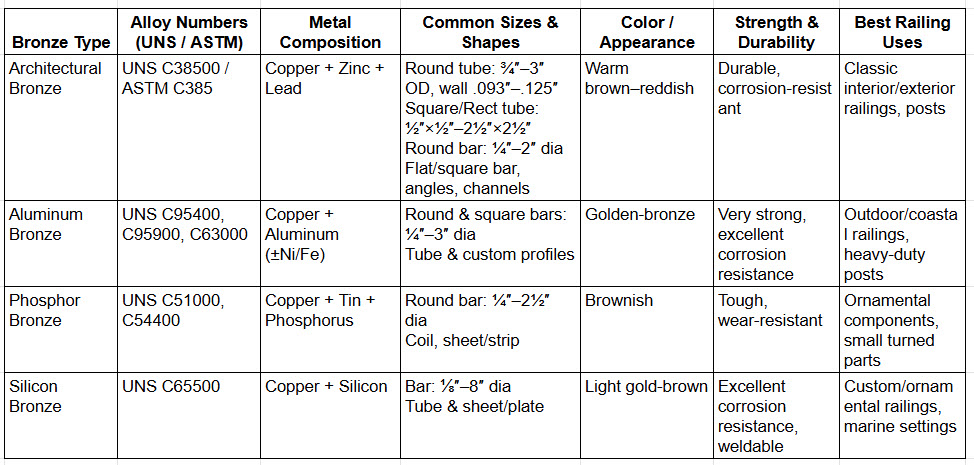 Choosing the right bronze for railings involves more than just selecting a beautiful metal. With so many alloy types, finishes, and shapes available, it can be challenging to understand which option works best for a specific design, environment, or structural requirement. This chart was created to provide a clear glance guide, helping designers, architects, and homeowners quickly compare bronze types.