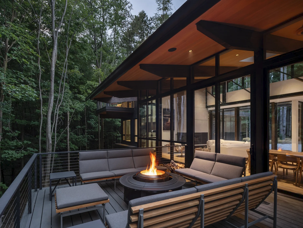 The decks on this home are designed to elevate outdoor living, featuring inviting lounge areas, a cozy fire pit for cool evenings, and a dedicated grilling and dining space that encourages gathering and entertaining outdoors. On the exterior, the cable railing posts are undermounted, offering a clean, streamlined look by concealing the bottom plate. The railing system is powder-coated to complement the exterior decking and furniture, creating a coordinated look.