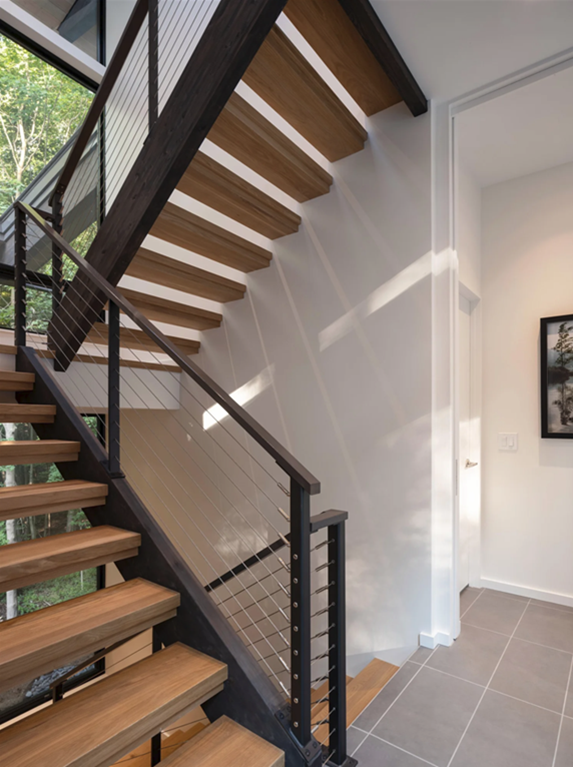 Inside, the cable railing system flows seamlessly up the multi-level staircase. The posts are powder-coated to complement the wood stringer, with custom-modified bottom plates that attach to the top edge of the stringer. The bottom plate hardware is finished to match the color of the post base plates, creating a cohesive and polished design.