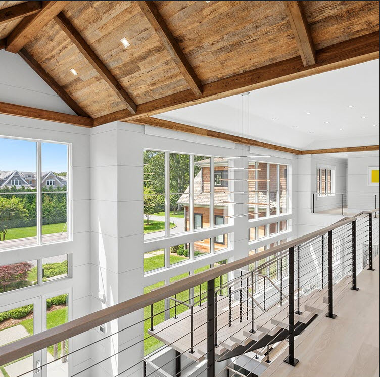 This entrance makes a striking first impression by turning the staircase into a defining architectural feature. Soaring ceilings with exposed wood beams draw the eye upward while expansive windows flood the space with natural light. The open staircase design, paired with sleek metal posts, horizontal cables, and a wood handrail, keeps the entry feeling airy and modern, creating a seamless connection between the two levels. The result is a refined gallery-like entrance where luxury is expressed through clean lines, natural materials, and thoughtful design.